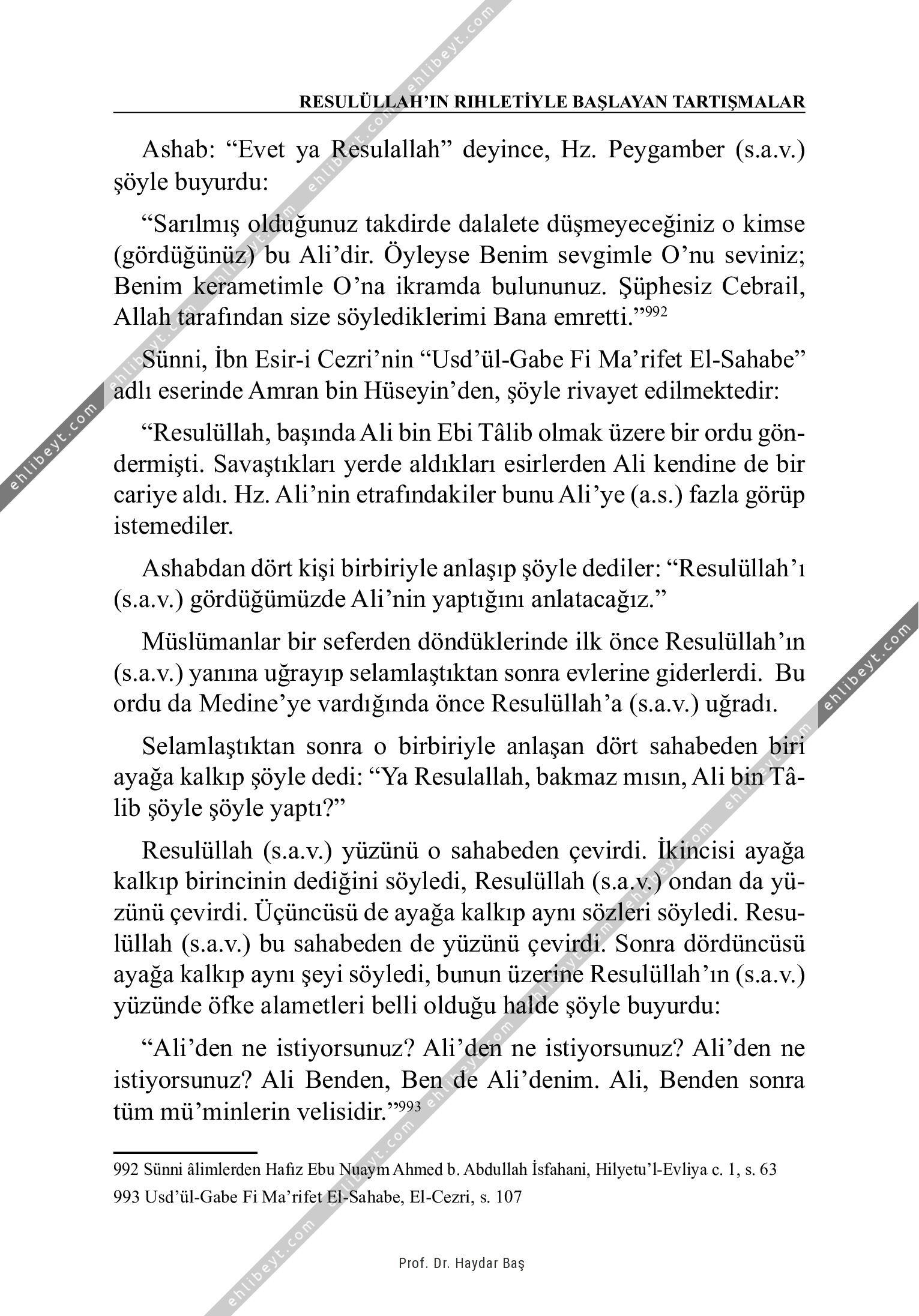 Ashab: "Evet ya Resulallah" deyince, Hz. Peygamber (s.a.v.) şöyle buyurdu: "Sarılmış olduğunuz takdirde dalalete düşmeyeceğiniz o kimse (gördüğünüz) bu Ali'dir. Öyleyse Benim sevgimle O'nu seviniz; Benim kerametimle O'na ikramda bulununuz. Şüphesiz Cebrail, Allah tarafından size söylediklerimi Bana emretti."992 Sünni, İbn Esir-i Cezri'nin "Usd'ül-Gabe Fi Ma'rifet El-Sahabe" adlı eserinde Amran bin Hüseyin'den, şöyle rivayet edilmektedir: "Resulüllah, başında Ali bin Ebi Tâlib olmak üzere bir ordu göndermişti. Savaştıkları yerde aldıkları esirlerden Ali kendine de bir cariye aldı. Hz. Ali'nin etrafındakiler bunu Ali'ye (a.s.) fazla görüp istemediler. Ashabdan dört kişi birbiriyle anlaşıp şöyle dediler: "Resulüllah'ı (s.a.v.) gördüğümüzde Ali'nin yaptığını anlatacağız." Müslümanlar bir seferden döndüklerinde ilk önce Resulüllah'ın (s.a.v.) yanına uğrayıp selamlaştıktan sonra evlerine giderlerdi. Bu ordu da Medine'ye vardığında önce Resulüllah'a (s.a.v.) uğradı. Selamlaştıktan sonra o birbiriyle anlaşan dört sahabeden biri ayağa kalkıp şöyle dedi: "Ya Resulallah, bakmaz mısın, Ali bin Tâlib şöyle şöyle yaptı?" Resulüllah (s.a.v.) yüzünü o sahabeden çevirdi. […]
