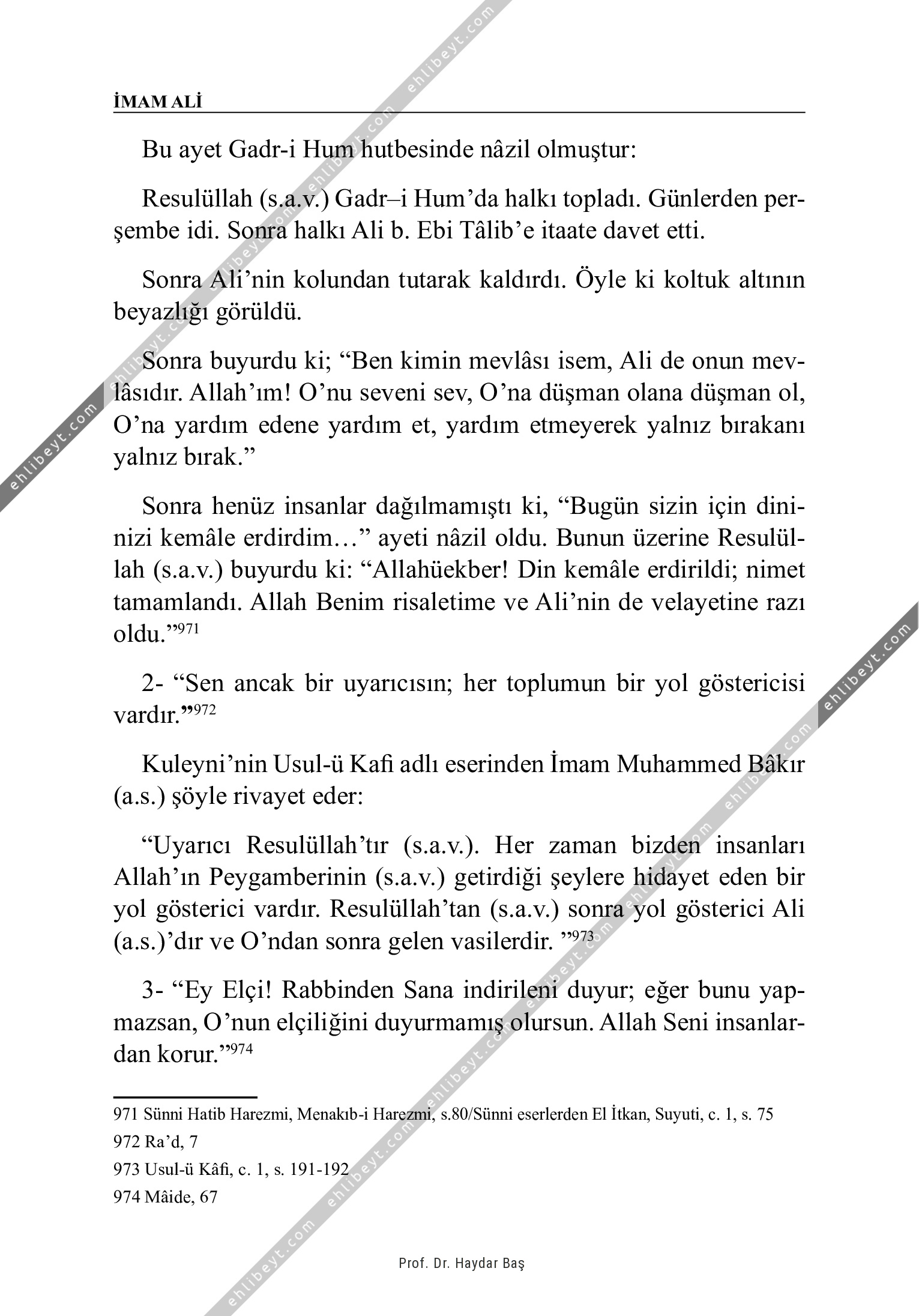 Bu ayet Gadr-i Hum hutbesinde nâzil olmuştur: Resulüllah (s.a.v.) Gadri Hum'da halkı topladı. Günlerden perşembe idi. Sonra halkı Ali b. Ebi Tâlib'e itaate davet etti. Sonra Ali'nin kolundan tutarak kaldırdı. Öyle ki koltuk altının beyazlığı görüldü. Sonra buyurdu ki; "Ben kimin mevlâsı isem, Ali de onun mevlâsıdır. Allah'ım! O'nu seveni sev, O'na düşman olana düşman ol, O'na yardım edene yardım et, yardım etmeyerek yalnız bırakanı yalnız bırak." Sonra henüz insanlar dağılmamıştı ki, "Bugün sizin için dininizi kemâle erdirdim..." ayeti nâzil oldu. Bunun üzerine Resulüllah (s.a.v.) buyurdu ki: "Allahüekber! Din kemâle erdirildi; nimet tamamlandı. Allah Benim risaletime ve Ali'nin de velayetine razı oldu."971 2- "Sen ancak bir uyarıcısın; her toplumun bir yol göstericisi vardır."972 Kuleyni'nin Usul-ü Kafi adlı eserinden İmam Muhammed Bâkır (a.s.) şöyle rivayet eder: "Uyarıcı Resulüllah'tır (s.a.v.). Her zaman bizden insanları Allah'ın Peygamberinin (s.a.v.) getirdiği şeylere hidayet eden bir yol gösterici vardır. Resulüllah'tan (s.a.v.) sonra […]
