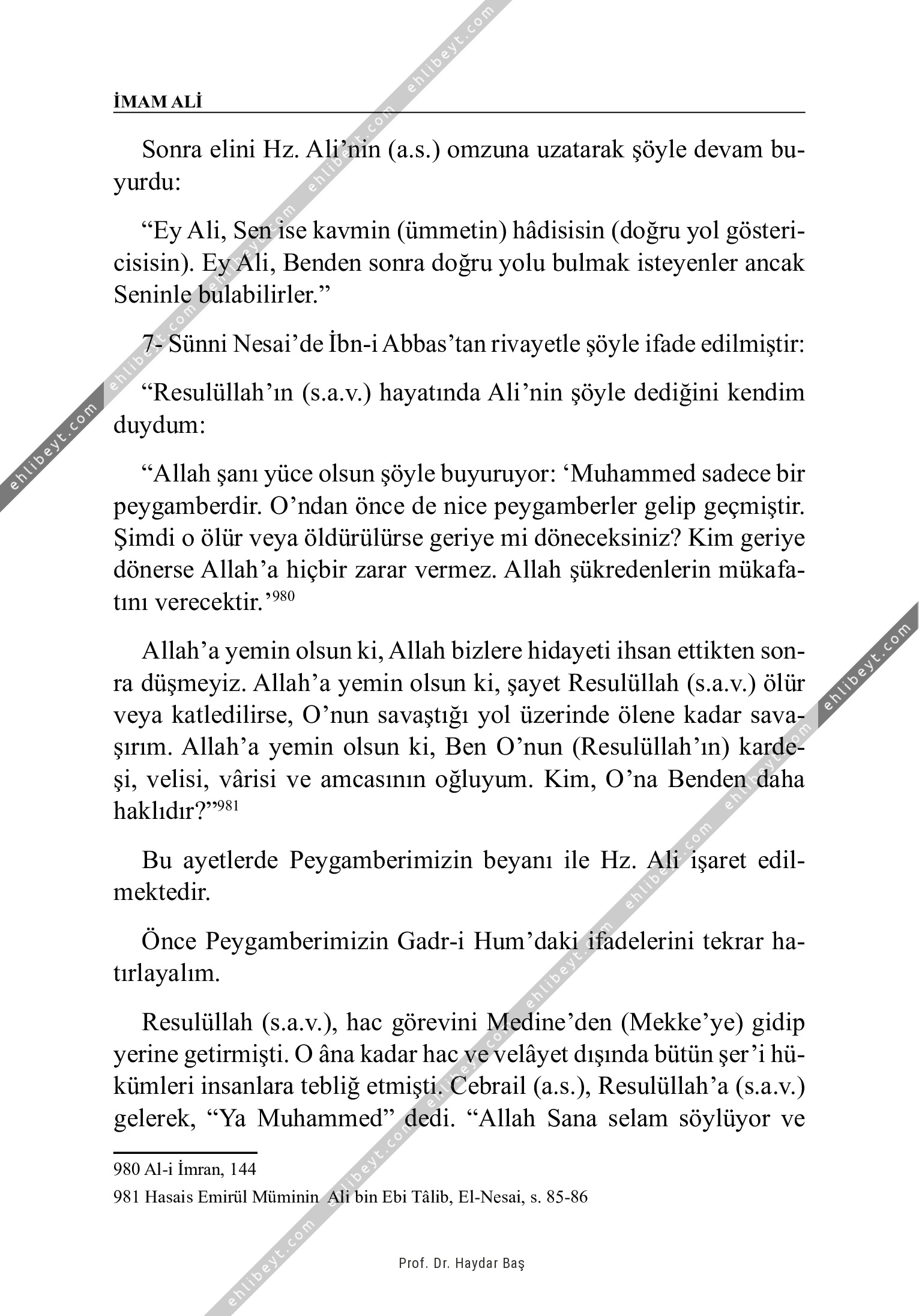Sonra elini Hz. Ali'nin (a.s.) omzuna uzatarak şöyle devam buyurdu: "Ey Ali, Sen ise kavmin (ümmetin) hâdisisin (doğru yol göstericisisin). Ey Ali, Benden sonra doğru yolu bulmak isteyenler ancak Seninle bulabilirler." 7- Sünni Nesai'de İbn-i Abbas'tan rivayetle şöyle ifade edilmiştir: "Resulüllah'ın (s.a.v.) hayatında Ali'nin şöyle dediğini kendim duydum: "Allah şanı yüce olsun şöyle buyuruyor: `Muhammed sadece bir peygamberdir. O'ndan önce de nice peygamberler gelip geçmiştir. Şimdi o ölür veya öldürülürse geriye mi döneceksiniz? Kim geriye dönerse Allah'a hiçbir zarar vermez. Allah şükredenlerin mükafatını verecektir.'980 Allah'a yemin olsun ki, Allah bizlere hidayeti ihsan ettikten sonra düşmeyiz. Allah'a yemin olsun ki, şayet Resulüllah (s.a.v.) ölür veya katledilirse, O'nun savaştığı yol üzerinde ölene kadar savaşırım. Allah'a yemin olsun ki, Ben O'nun (Resulüllah'ın) kardeşi, velisi, vârisi ve amcasının oğluyum. Kim, O'na Benden daha haklıdır?"981 Bu ayetlerde Peygamberimizin beyanı ile Hz. Ali işaret edilmektedir. Önce Peygamberimizin Gadr-i Hum'daki […]