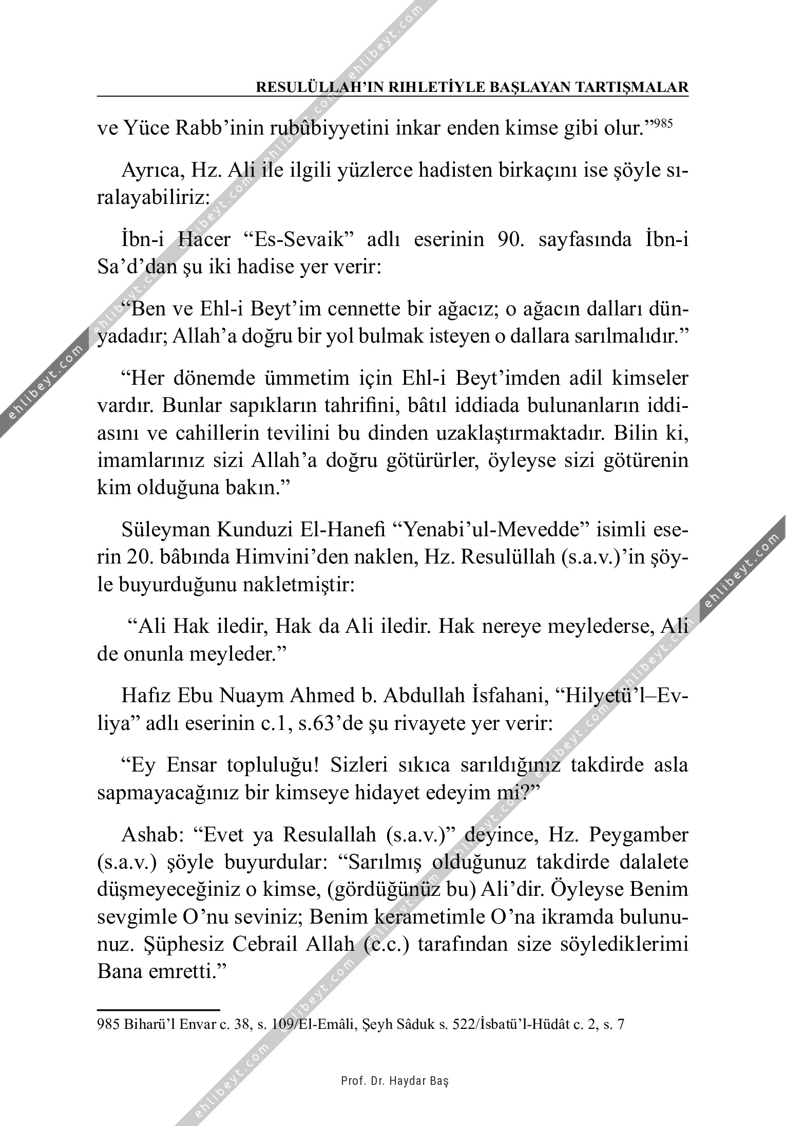 ve Yüce Rabb'inin rubûbiyyetini inkar enden kimse gibi olur."985 Ayrıca, Hz. Ali ile ilgili yüzlerce hadisten birkaçını ise şöyle sıralayabiliriz: İbn-i Hacer "Es-Sevaik" adlı eserinin 90. sayfasında İbn-i Sa'd'dan şu iki hadise yer verir: "Ben ve Ehl-i Beyt'im cennette bir ağacız; o ağacın dalları dünyadadır; Allah'a doğru bir yol bulmak isteyen o dallara sarılmalıdır." "Her dönemde ümmetim için Ehl-i Beyt'imden adil kimseler vardır. Bunlar sapıkların tahrifini, bâtıl iddiada bulunanların iddiasını ve cahillerin tevilini bu dinden uzaklaştırmaktadır. Bilin ki, imamlarınız sizi Allah'a doğru götürürler, öyleyse sizi götürenin kim olduğuna bakın." Süleyman Kunduzi El-Hanefi "Yenabi'ul-Mevedde" isimli eserin 20. bâbında Himvini'den naklen, Hz. Resulüllah (s.a.v.)'in şöyle buyurduğunu nakletmiştir: "Ali Hak iledir, Hak da Ali iledir. Hak nereye meylederse, Ali de onunla meyleder." Hafız Ebu Nuaym Ahmed b. Abdullah İsfahani, "Hilyetü'lEvliya" adlı eserinin c.1, s.63'de şu rivayete yer verir: "Ey Ensar topluluğu! Sizleri sıkıca sarıldığınız takdirde asla sapmayacağınız […]