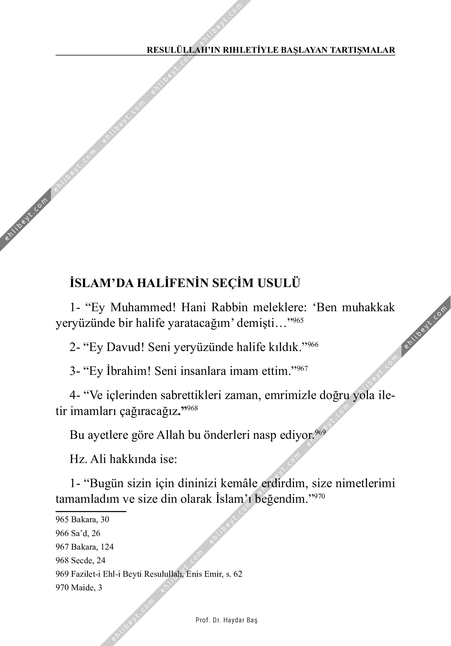 1- "Ey Muhammed! Hani Rabbin meleklere: `Ben muhakkak yeryüzünde bir halife yaratacağım' demişti..."965 2- "Ey Davud! Seni yeryüzünde halife kıldık."966 3- "Ey İbrahim! Seni insanlara imam ettim."967 4- "Ve içlerinden sabrettikleri zaman, emrimizle doğru yola iletir imamları çağıracağız."968 Bu ayetlere göre Allah bu önderleri nasp ediyor.969 Hz. Ali hakkında ise: 1- "Bugün sizin için dininizi kemâle erdirdim, size nimetlerimi tamamladım ve size din olarak İslam'ı beğendim."970 965 Bakara, 30 966 Sa'd, 26 967 Bakara, 124 968 Secde, 24 969 Fazilet-i Ehl-i Beyti Resulullah, Enis Emir, s. 62 970 Maide, 3