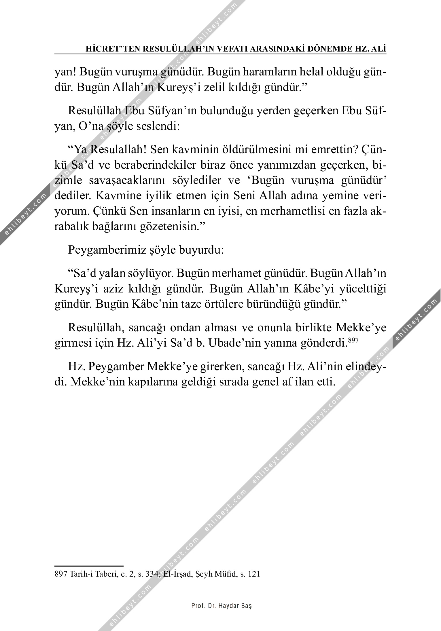 yan! Bugün vuruşma günüdür. Bugün haramların helal olduğu gündür. Bugün Allah'ın Kureyş'i zelil kıldığı gündür." Resulüllah Ebu Süfyan'ın bulunduğu yerden geçerken Ebu Süfyan, O'na şöyle seslendi: "Ya Resulallah! Sen kavminin öldürülmesini mi emrettin? Çünkü Sa'd ve beraberindekiler biraz önce yanımızdan geçerken, bizimle savaşacaklarını söylediler ve `Bugün vuruşma günüdür' dediler. Kavmine iyilik etmen için Seni Allah adına yemine veriyorum. Çünkü Sen insanların en iyisi, en merhametlisi en fazla akrabalık bağlarını gözetenisin." Peygamberimiz şöyle buyurdu: "Sa'd yalan söylüyor. Bugün merhamet günüdür. Bugün Allah'ın Kureyş'i aziz kıldığı gündür. Bugün Allah'ın Kâbe'yi yücelttiği gündür. Bugün Kâbe'nin taze örtülere büründüğü gündür." Resulüllah, sancağı ondan alması ve onunla birlikte Mekke'ye girmesi için Hz. Ali'yi Sa'd b. Ubade'nin yanına gönderdi.897 Hz. Peygamber Mekke'ye girerken, sancağı Hz. Ali'nin elindeydi. Mekke'nin kapılarına geldiği sırada genel af ilan etti. 897 Tarih-i Taberi, c. 2, s. 334; El-İrşad, Şeyh Müfid, s. 121