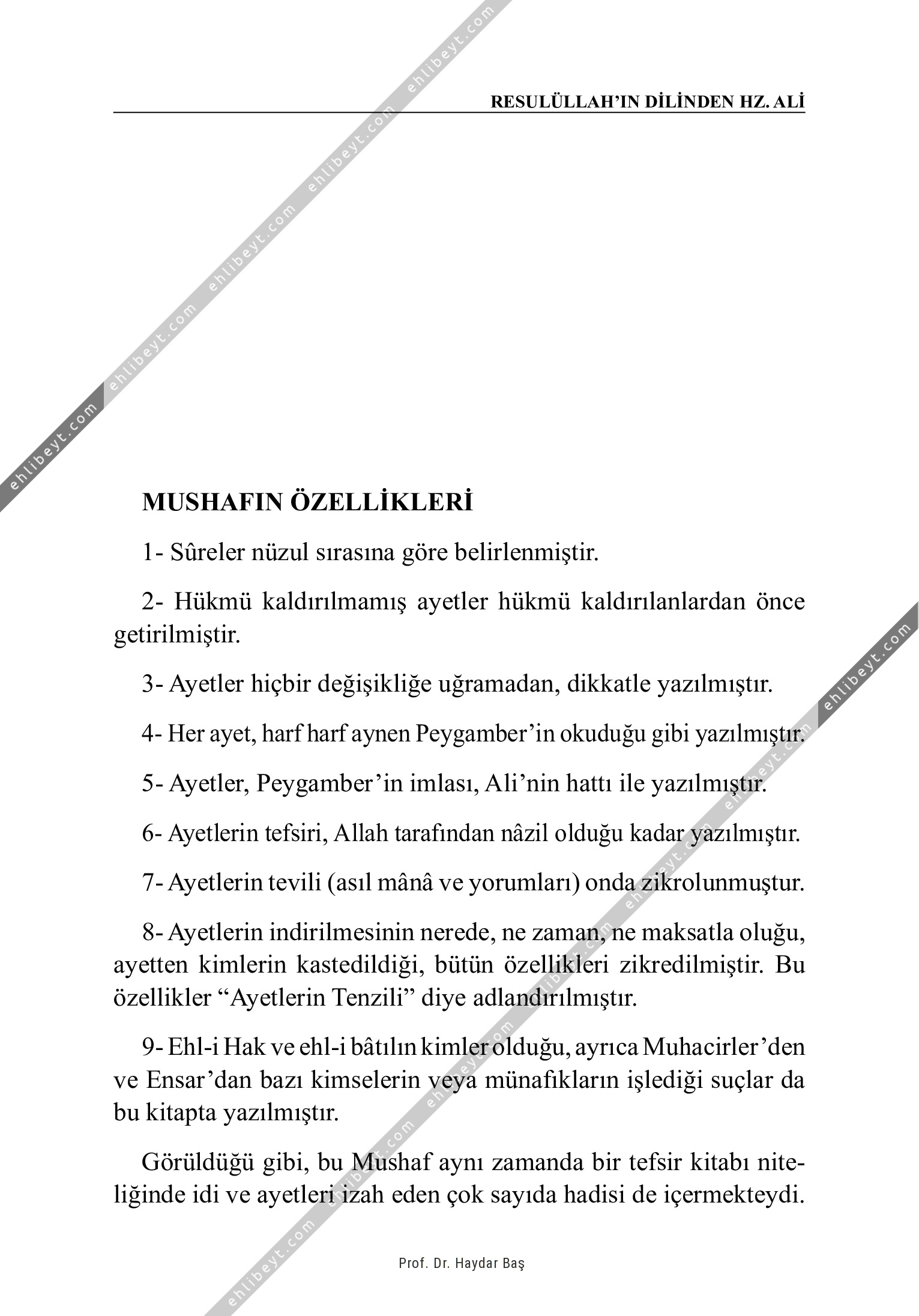 1- Sûreler nüzul sırasına göre belirlenmiştir. 2- Hükmü kaldırılmamış ayetler hükmü kaldırılanlardan önce getirilmiştir. 3- Ayetler hiçbir değişikliğe uğramadan, dikkatle yazılmıştır. 4- Her ayet, harf harf aynen Peygamber'in okuduğu gibi yazılmıştır. 5- Ayetler, Peygamber'in imlası, Ali'nin hattı ile yazılmıştır. 6- Ayetlerin tefsiri, Allah tarafından nâzil olduğu kadar yazılmıştır. 7- Ayetlerin tevili (asıl mânâ ve yorumları) onda zikrolunmuştur. 8- Ayetlerin indirilmesinin nerede, ne zaman, ne maksatla oluğu, ayetten kimlerin kastedildiği, bütün özellikleri zikredilmiştir. Bu özellikler "Ayetlerin Tenzili" diye adlandırılmıştır. 9- Ehl-i Hak ve ehl-i bâtılın kimler olduğu, ayrıca Muhacirler'den ve Ensar'dan bazı kimselerin veya münafıkların işlediği suçlar da bu kitapta yazılmıştır. Görüldüğü gibi, bu Mushaf aynı zamanda bir tefsir kitabı niteliğinde idi ve ayetleri izah eden çok sayıda hadisi de içermekteydi.