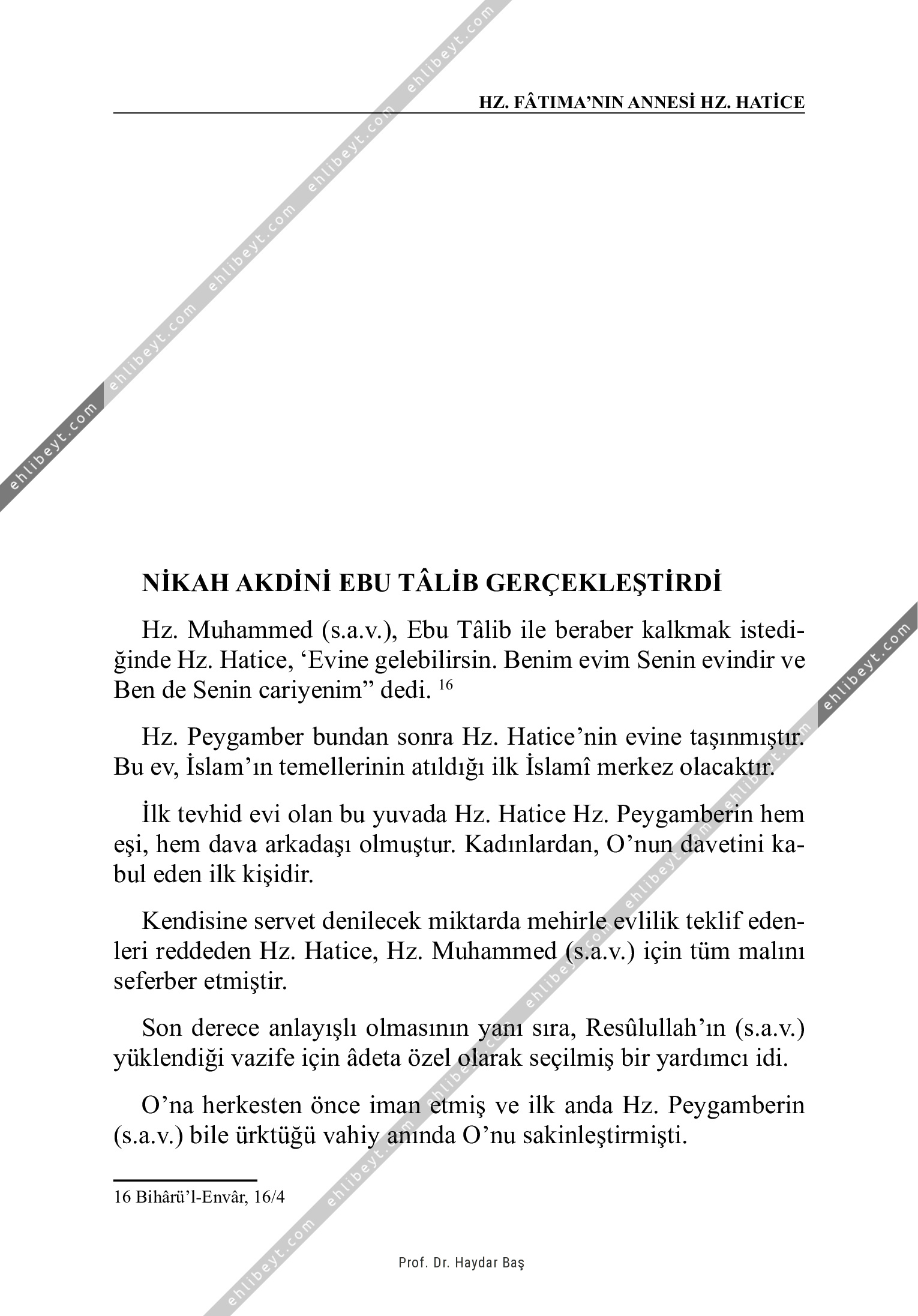 Hz. Muhammed (s.a.v.), Ebu Tâlib ile beraber kalkmak istediğinde Hz. Hatice, `Evine gelebilirsin. Benim evim Senin evindir ve Ben de Senin cariyenim" dedi. 16 Hz. Peygamber bundan sonra Hz. Hatice'nin evine taşınmıştır. Bu ev, İslam'ın temellerinin atıldığı ilk İslamî merkez olacaktır. İlk tevhid evi olan bu yuvada Hz. Hatice Hz. Peygamberin hem eşi, hem dava arkadaşı olmuştur. Kadınlardan, O'nun davetini kabul eden ilk kişidir. Kendisine servet denilecek miktarda mehirle evlilik teklif edenleri reddeden Hz. Hatice, Hz. Muhammed (s.a.v.) için tüm malını seferber etmiştir. Son derece anlayışlı olmasının yanı sıra, Resûlullah'ın (s.a.v.) yüklendiği vazife için âdeta özel olarak seçilmiş bir yardımcı idi. O'na herkesten önce iman etmiş ve ilk anda Hz. Peygamberin (s.a.v.) bile ürktüğü vahiy anında O'nu sakinleştirmişti. 16 Bihârü'l-Envâr, 16/4