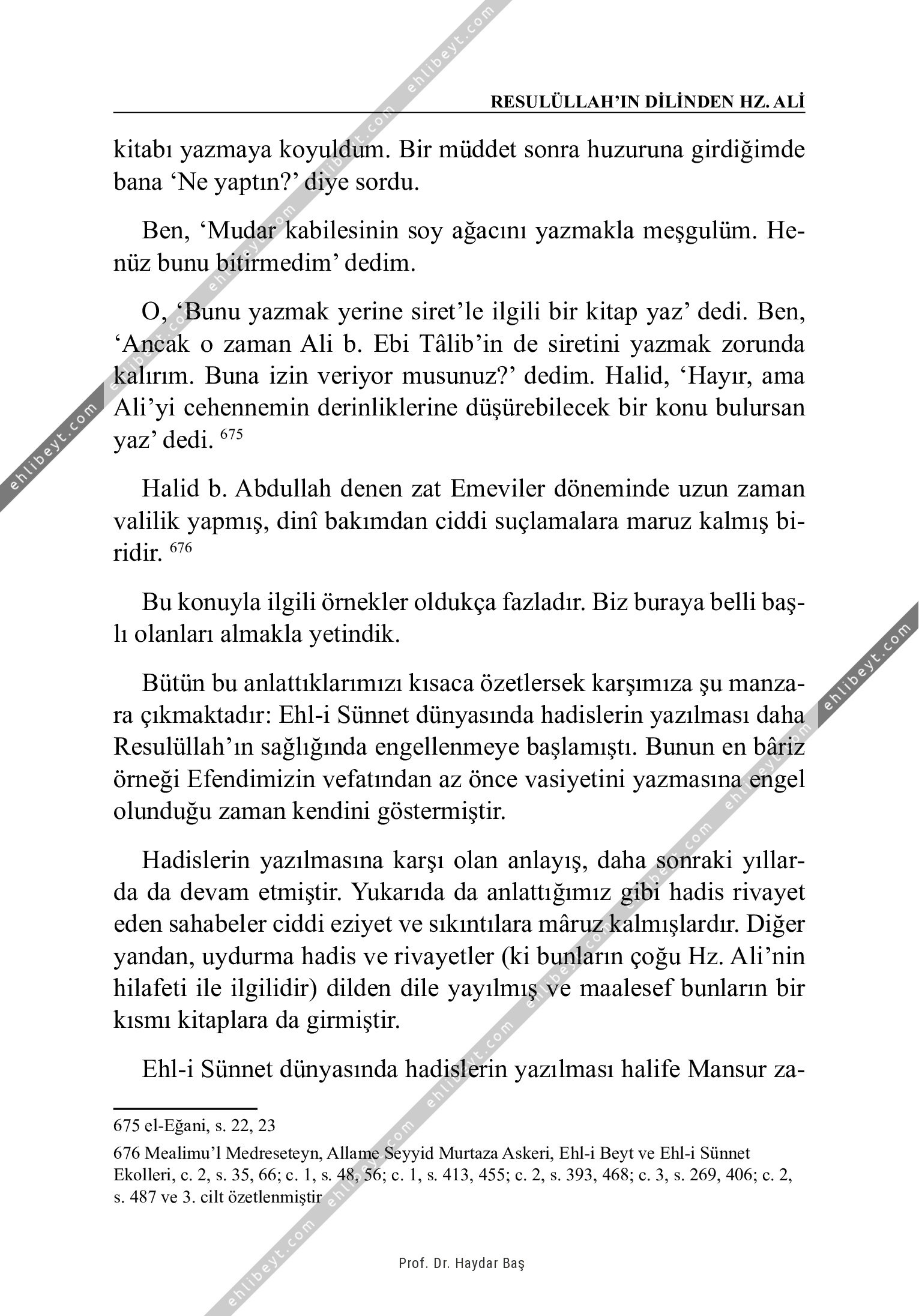 kitabı yazmaya koyuldum. Bir müddet sonra huzuruna girdiğimde bana `Ne yaptın?' diye sordu. Ben, `Mudar kabilesinin soy ağacını yazmakla meşgulüm. Henüz bunu bitirmedim' dedim. O, `Bunu yazmak yerine siret'le ilgili bir kitap yaz' dedi. Ben, `Ancak o zaman Ali b. Ebi Tâlib'in de siretini yazmak zorunda kalırım. Buna izin veriyor musunuz?' dedim. Halid, `Hayır, ama Ali'yi cehennemin derinliklerine düşürebilecek bir konu bulursan yaz' dedi. 675 Halid b. Abdullah denen zat Emeviler döneminde uzun zaman valilik yapmış, dinî bakımdan ciddi suçlamalara maruz kalmış biridir. 676 Bu konuyla ilgili örnekler oldukça fazladır. Biz buraya belli başlı olanları almakla yetindik. Bütün bu anlattıklarımızı kısaca özetlersek karşımıza şu manzara çıkmaktadır: Ehl-i Sünnet dünyasında hadislerin yazılması daha Resulüllah'ın sağlığında engellenmeye başlamıştı. Bunun en bâriz örneği Efendimizin vefatından az önce vasiyetini yazmasına engel olunduğu zaman kendini göstermiştir. Hadislerin yazılmasına karşı olan anlayış, daha sonraki yıllarda da devam etmiştir. Yukarıda da anlattığımız […]