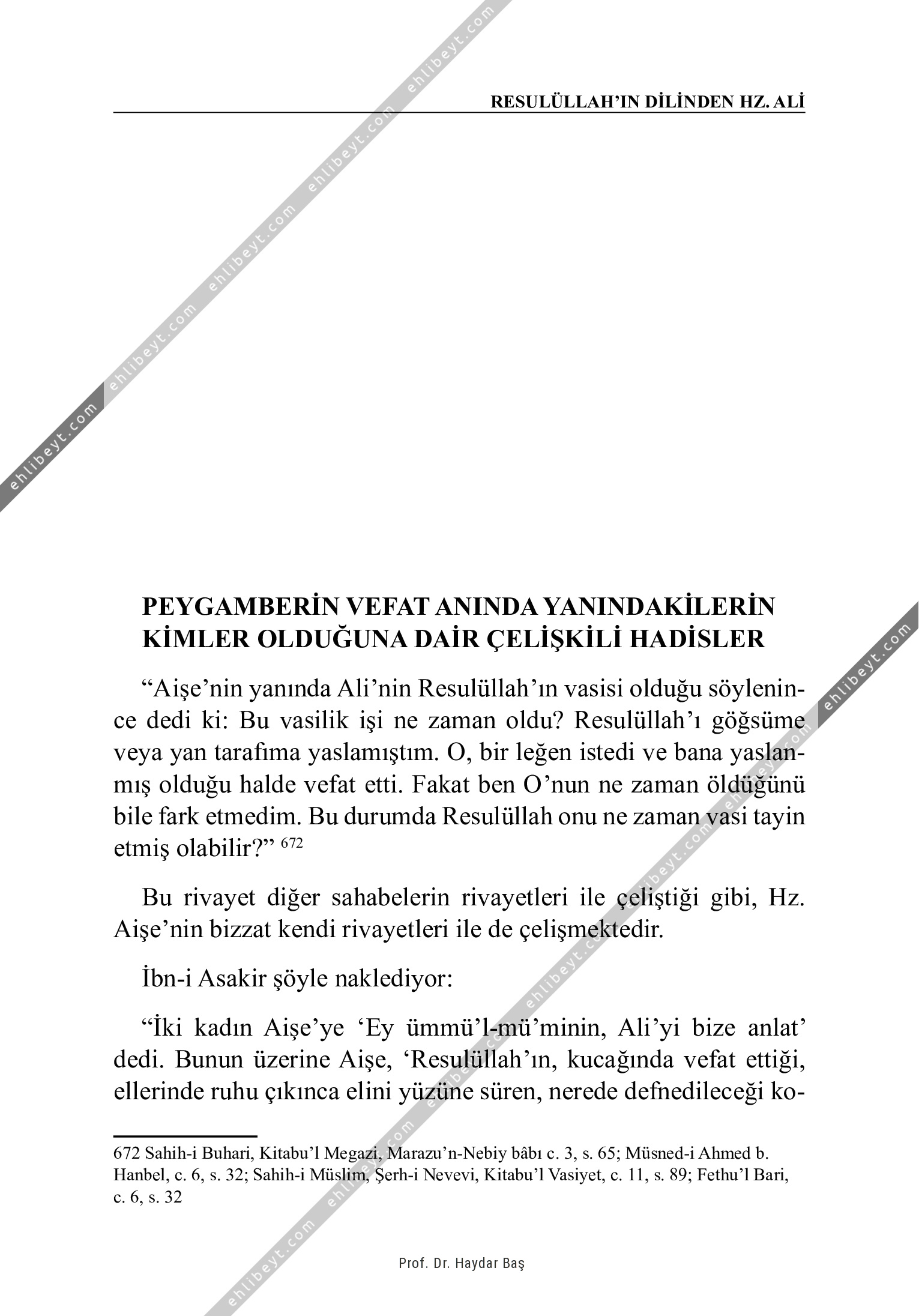 "Aişe'nin yanında Ali'nin Resulüllah'ın vasisi olduğu söylenince dedi ki: Bu vasilik işi ne zaman oldu? Resulüllah'ı göğsüme veya yan tarafıma yaslamıştım. O, bir leğen istedi ve bana yaslanmış olduğu halde vefat etti. Fakat ben O'nun ne zaman öldüğünü bile fark etmedim. Bu durumda Resulüllah onu ne zaman vasi tayin etmiş olabilir?" 672 Bu rivayet diğer sahabelerin rivayetleri ile çeliştiği gibi, Hz. Aişe'nin bizzat kendi rivayetleri ile de çelişmektedir. İbn-i Asakir şöyle naklediyor: "İki kadın Aişe'ye `Ey ümmü'l-mü'minin, Ali'yi bize anlat' dedi. Bunun üzerine Aişe, `Resulüllah'ın, kucağında vefat ettiği, ellerinde ruhu çıkınca elini yüzüne süren, nerede defnedileceği ko672 Sahih-i Buhari, Kitabu'l Megazi, Marazu'n-Nebiy bâbı c. 3, s. 65; Müsned-i Ahmed b. Hanbel, c. 6, s. 32; Sahih-i Müslim, Şerh-i Nevevi, Kitabu'l Vasiyet, c. 11, s. 89; Fethu'l Bari, c. 6, s. 32