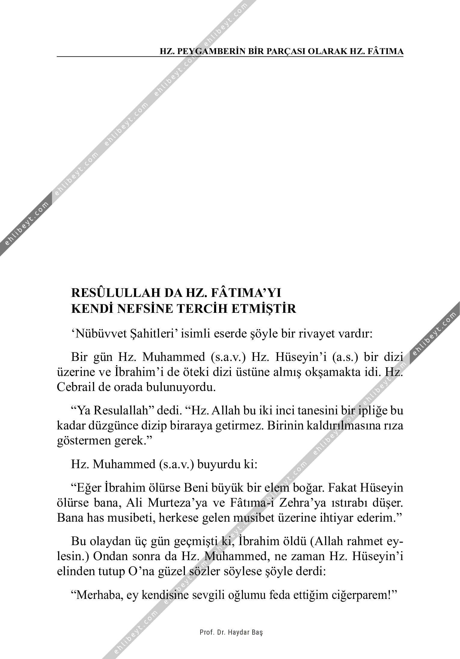 `Nübüvvet Şahitleri' isimli eserde şöyle bir rivayet vardır: Bir gün Hz. Muhammed (s.a.v.) Hz. Hüseyin'i (a.s.) bir dizi üzerine ve İbrahim'i de öteki dizi üstüne almış okşamakta idi. Hz. Cebrail de orada bulunuyordu. "Ya Resulallah" dedi. "Hz. Allah bu iki inci tanesini bir ipliğe bu kadar düzgünce dizip biraraya getirmez. Birinin kaldırılmasına rıza göstermen gerek." Hz. Muhammed (s.a.v.) buyurdu ki: "Eğer İbrahim ölürse Beni büyük bir elem boğar. Fakat Hüseyin ölürse bana, Ali Murteza'ya ve Fâtıma-i Zehra'ya ıstırabı düşer. Bana has musibeti, herkese gelen musibet üzerine ihtiyar ederim." Bu olaydan üç gün geçmişti ki, İbrahim öldü (Allah rahmet eylesin.) Ondan sonra da Hz. Muhammed, ne zaman Hz. Hüseyin'i elinden tutup O'na güzel sözler söylese şöyle derdi: "Merhaba, ey kendisine sevgili oğlumu feda ettiğim ciğerparem!"