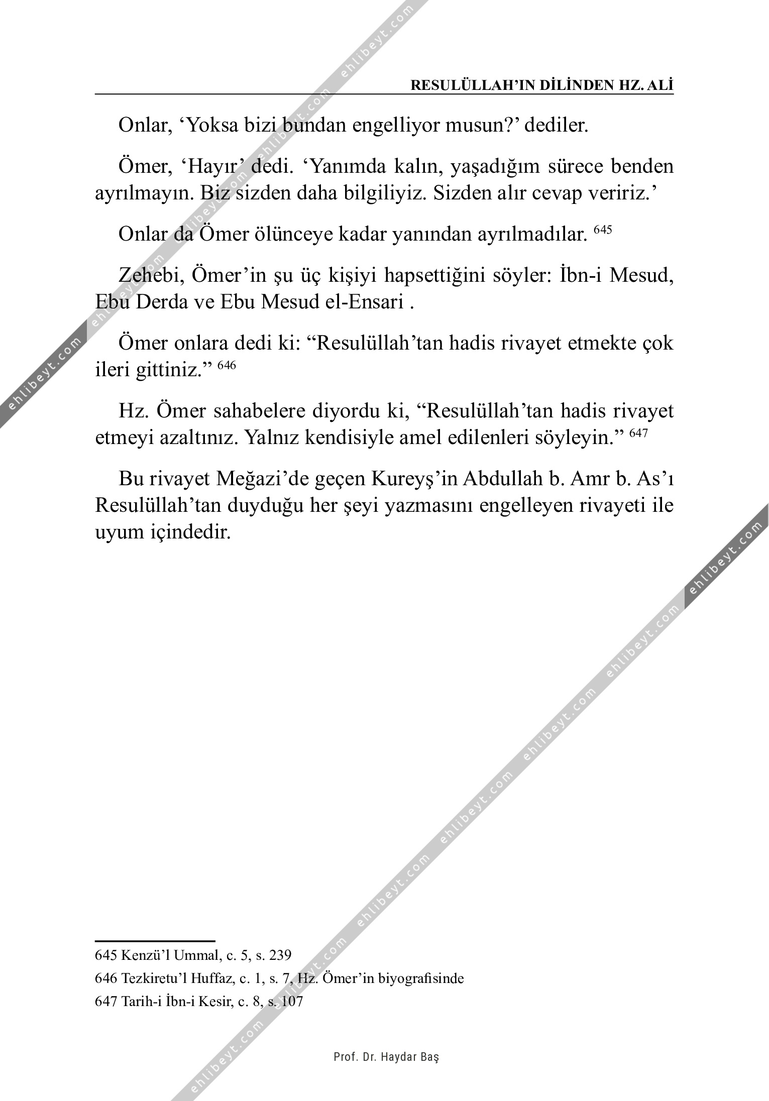 Onlar, `Yoksa bizi bundan engelliyor musun?' dediler. Ömer, `Hayır' dedi. `Yanımda kalın, yaşadığım sürece benden ayrılmayın. Biz sizden daha bilgiliyiz. Sizden alır cevap veririz.' Onlar da Ömer ölünceye kadar yanından ayrılmadılar. 645 Zehebi, Ömer'in şu üç kişiyi hapsettiğini söyler: İbn-i Mesud, Ebu Derda ve Ebu Mesud el-Ensari . Ömer onlara dedi ki: "Resulüllah'tan hadis rivayet etmekte çok ileri gittiniz." 646 Hz. Ömer sahabelere diyordu ki, "Resulüllah'tan hadis rivayet etmeyi azaltınız. Yalnız kendisiyle amel edilenleri söyleyin." 647 Bu rivayet Meğazi'de geçen Kureyş'in Abdullah b. Amr b. As'ı Resulüllah'tan duyduğu her şeyi yazmasını engelleyen rivayeti ile uyum içindedir. 645 Kenzü'l Ummal, c. 5, s. 239 646 Tezkiretu'l Huffaz, c. 1, s. 7, Hz. Ömer'in biyografisinde 647 Tarih-i İbn-i Kesir, c. 8, s. 107