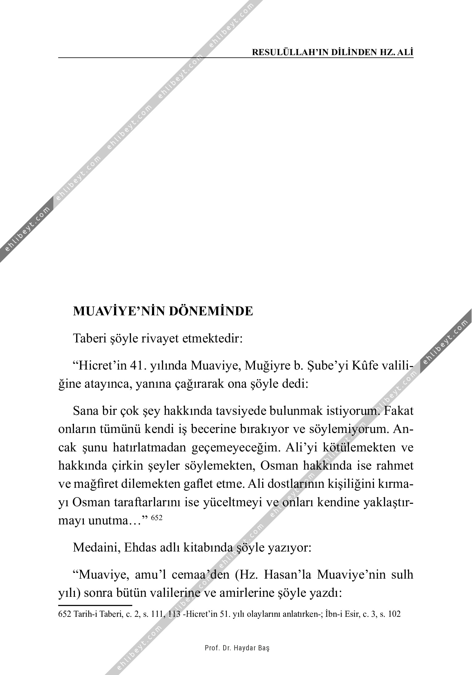 Taberi şöyle rivayet etmektedir: "Hicret'in 41. yılında Muaviye, Muğiyre b. Şube'yi Kûfe valiliğine atayınca, yanına çağırarak ona şöyle dedi: Sana bir çok şey hakkında tavsiyede bulunmak istiyorum. Fakat onların tümünü kendi iş becerine bırakıyor ve söylemiyorum. Ancak şunu hatırlatmadan geçemeyeceğim. Ali'yi kötülemekten ve hakkında çirkin şeyler söylemekten, Osman hakkında ise rahmet ve mağfiret dilemekten gaflet etme. Ali dostlarının kişiliğini kırmayı Osman taraftarlarını ise yüceltmeyi ve onları kendine yaklaştırmayı unutma..." 652 Medaini, Ehdas adlı kitabında şöyle yazıyor: "Muaviye, amu'l cemaa'den (Hz. Hasan'la Muaviye'nin sulh yılı) sonra bütün valilerine ve amirlerine şöyle yazdı: 652 Tarih-i Taberi, c. 2, s. 111, 113 -Hicret'in 51. yılı olaylarını anlatırken-; İbn-i Esir, c. 3, s. 102