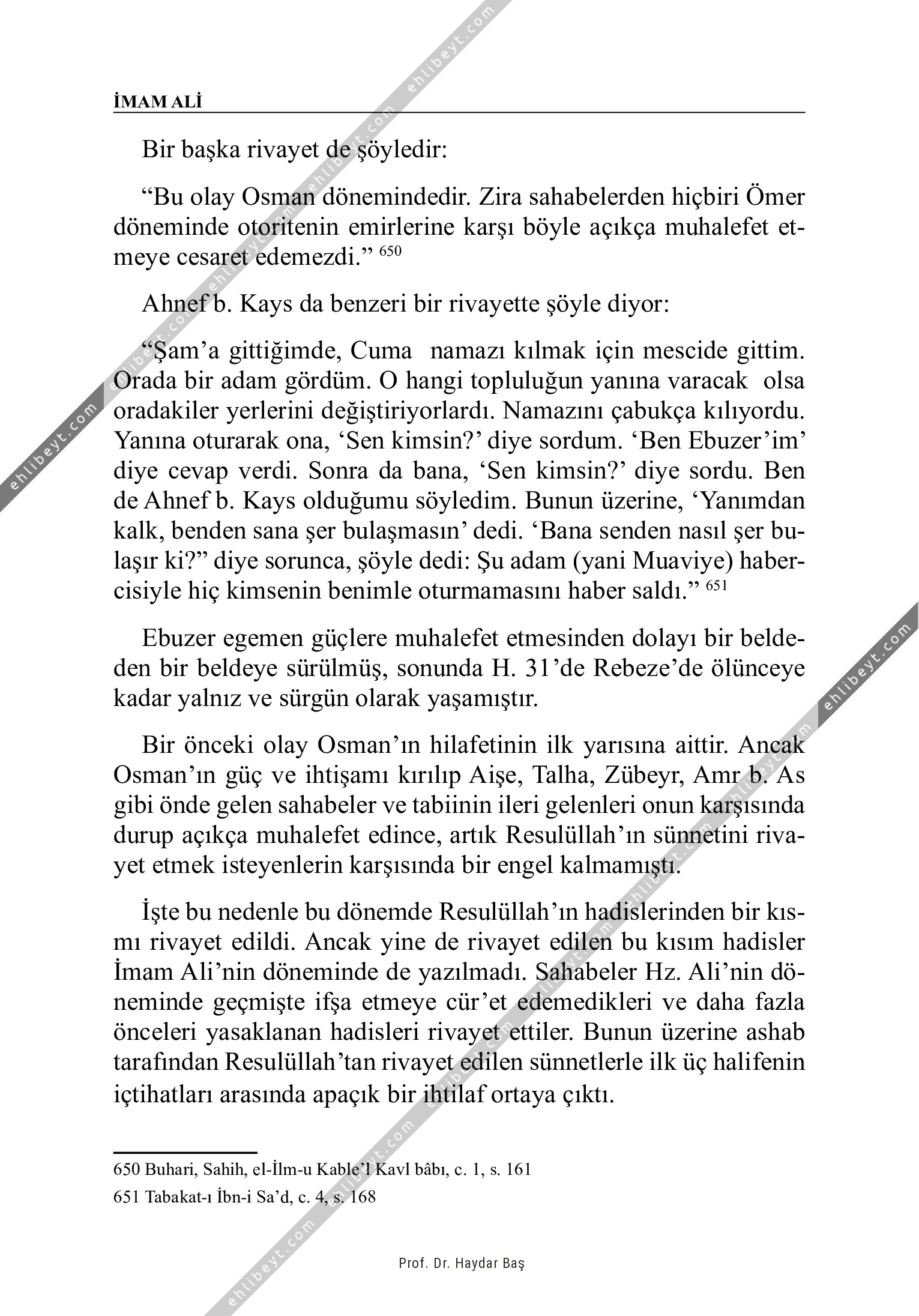 Bir başka rivayet de şöyledir: "Bu olay Osman dönemindedir. Zira sahabelerden hiçbiri Ömer döneminde otoritenin emirlerine karşı böyle açıkça muhalefet etmeye cesaret edemezdi." 650 Ahnef b. Kays da benzeri bir rivayette şöyle diyor: "Şam'a gittiğimde, Cuma namazı kılmak için mescide gittim. Orada bir adam gördüm. O hangi topluluğun yanına varacak olsa oradakiler yerlerini değiştiriyorlardı. Namazını çabukça kılıyordu. Yanına oturarak ona, `Sen kimsin?' diye sordum. `Ben Ebuzer'im' diye cevap verdi. Sonra da bana, `Sen kimsin?' diye sordu. Ben de Ahnef b. Kays olduğumu söyledim. Bunun üzerine, `Yanımdan kalk, benden sana şer bulaşmasın' dedi. `Bana senden nasıl şer bulaşır ki?" diye sorunca, şöyle dedi: Şu adam (yani Muaviye) habercisiyle hiç kimsenin benimle oturmamasını haber saldı." 651 Ebuzer egemen güçlere muhalefet etmesinden dolayı bir beldeden bir beldeye sürülmüş, sonunda H. 31'de Rebeze'de ölünceye kadar yalnız ve sürgün olarak yaşamıştır. Bir önceki olay Osman'ın hilafetinin ilk yarısına aittir. Ancak Osman'ın […]
