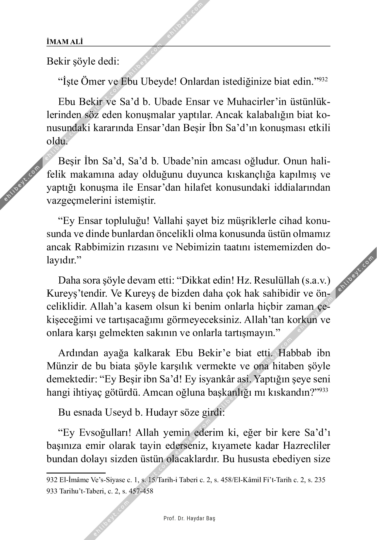 Bekir şöyle dedi: "İşte Ömer ve Ebu Ubeyde! Onlardan istediğinize biat edin."932 Ebu Bekir ve Sa'd b. Ubade Ensar ve Muhacirler'in üstünlüklerinden söz eden konuşmalar yaptılar. Ancak kalabalığın biat konusundaki kararında Ensar'dan Beşir İbn Sa'd'ın konuşması etkili oldu. Beşir İbn Sa'd, Sa'd b. Ubade'nin amcası oğludur. Onun halifelik makamına aday olduğunu duyunca kıskançlığa kapılmış ve yaptığı konuşma ile Ensar'dan hilafet konusundaki iddialarından vazgeçmelerini istemiştir. "Ey Ensar topluluğu! Vallahi şayet biz müşriklerle cihad konusunda ve dinde bunlardan öncelikli olma konusunda üstün olmamız ancak Rabbimizin rızasını ve Nebimizin taatını istememizden dolayıdır." Daha sora şöyle devam etti: "Dikkat edin! Hz. Resulüllah (s.a.v.) Kureyş'tendir. Ve Kureyş de bizden daha çok hak sahibidir ve önceliklidir. Allah'a kasem olsun ki benim onlarla hiçbir zaman çekişeceğimi ve tartışacağımı görmeyeceksiniz. Allah'tan korkun ve onlara karşı gelmekten sakının ve onlarla tartışmayın." Ardından ayağa kalkarak Ebu Bekir'e biat etti. Habbab ibn Münzir de […]