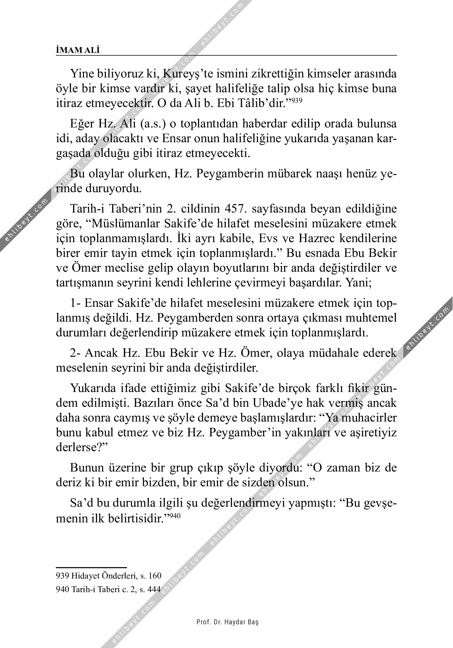 Yine biliyoruz ki, Kureyş'te ismini zikrettiğin kimseler arasında öyle bir kimse vardır ki, şayet halifeliğe talip olsa hiç kimse buna itiraz etmeyecektir. O da Ali b. Ebi Tâlib'dir."939 Eğer Hz. Ali (a.s.) o toplantıdan haberdar edilip orada bulunsa idi, aday olacaktı ve Ensar onun halifeliğine yukarıda yaşanan kargaşada olduğu gibi itiraz etmeyecekti. Bu olaylar olurken, Hz. Peygamberin mübarek naaşı henüz yerinde duruyordu. Tarih-i Taberi'nin 2. cildinin 457. sayfasında beyan edildiğine göre, "Müslümanlar Sakife'de hilafet meselesini müzakere etmek için toplanmamışlardı. İki ayrı kabile, Evs ve Hazrec kendilerine birer emir tayin etmek için toplanmışlardı." Bu esnada Ebu Bekir ve Ömer meclise gelip olayın boyutlarını bir anda değiştirdiler ve tartışmanın seyrini kendi lehlerine çevirmeyi başardılar. Yani; 1- Ensar Sakife'de hilafet meselesini müzakere etmek için toplanmış değildi. Hz. Peygamberden sonra ortaya çıkması muhtemel durumları değerlendirip müzakere etmek için toplanmışlardı. 2- Ancak Hz. Ebu Bekir ve Hz. Ömer, olaya müdahale ederek meselenin […]