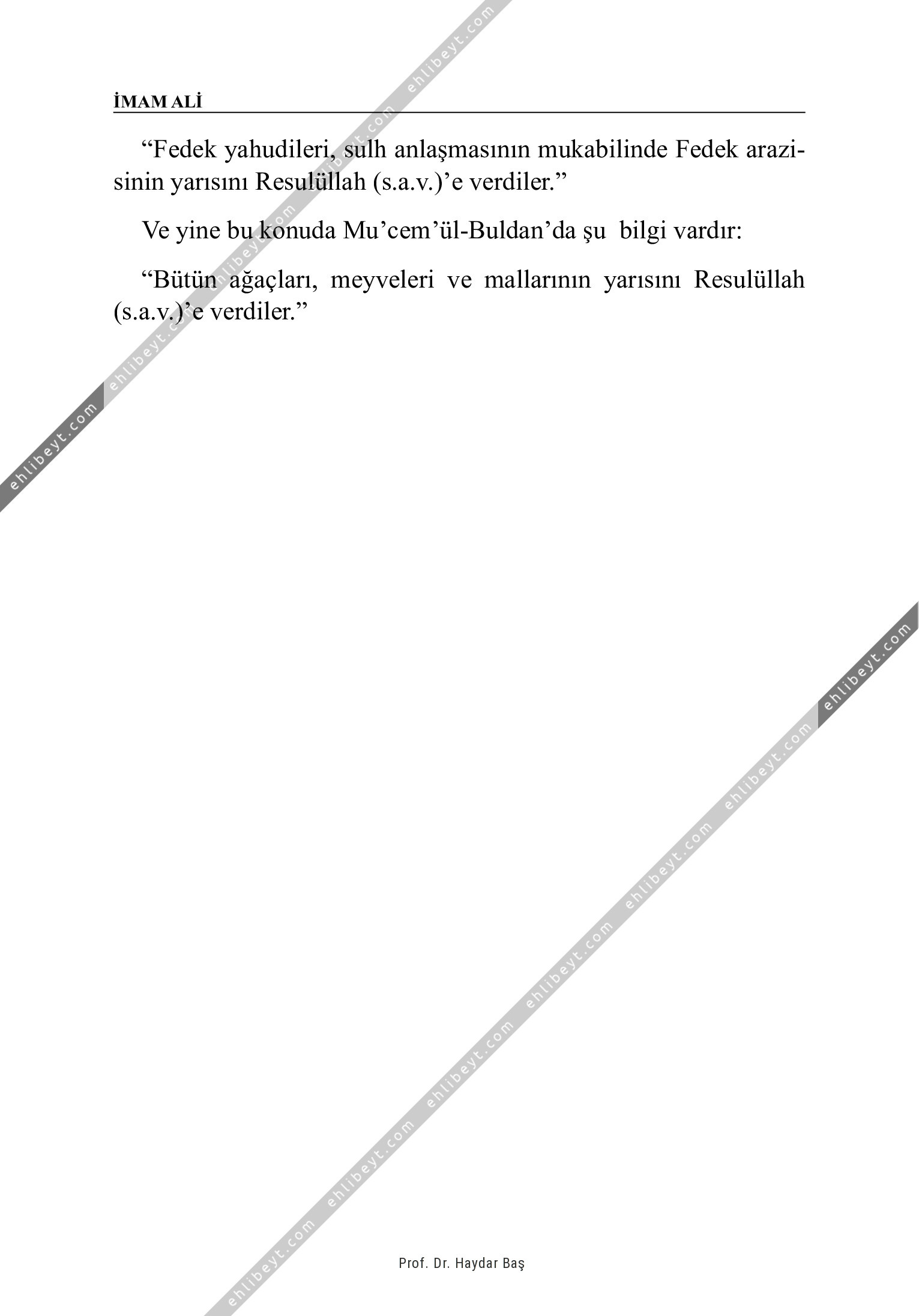 "Fedek yahudileri, sulh anlaşmasının mukabilinde Fedek arazisinin yarısını Resulüllah (s.a.v.)'e verdiler." Ve yine bu konuda Mu'cem'ül-Buldan'da şu bilgi vardır: "Bütün ağaçları, meyveleri ve mallarının yarısını Resulüllah (s.a.v.)'e verdiler."
