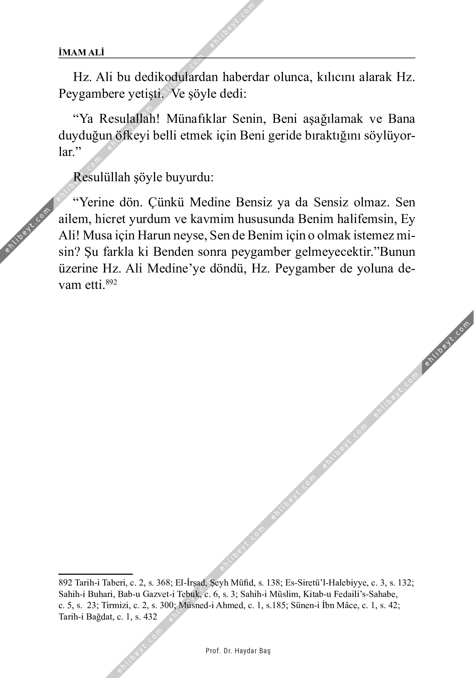 Hz. Ali bu dedikodulardan haberdar olunca, kılıcını alarak Hz. Peygambere yetişti. Ve şöyle dedi: "Ya Resulallah! Münafıklar Senin, Beni aşağılamak ve Bana duyduğun öfkeyi belli etmek için Beni geride bıraktığını söylüyorlar." Resulüllah şöyle buyurdu: "Yerine dön. Çünkü Medine Bensiz ya da Sensiz olmaz. Sen ailem, hicret yurdum ve kavmim hususunda Benim halifemsin, Ey Ali! Musa için Harun neyse, Sen de Benim için o olmak istemez misin? Şu farkla ki Benden sonra peygamber gelmeyecektir."Bunun üzerine Hz. Ali Medine'ye döndü, Hz. Peygamber de yoluna devam etti.892   892 Tarih-i Taberi, c. 2, s. 368; El-İrşad, Şeyh Müfid, s. 138; Es-Siretü'l-Halebiyye, c. 3, s. 132; Sahih-i Buhari, Bab-u Gazvet-i Tebuk, c. 6, s. 3; Sahih-i Müslim, Kitab-u Fedaili's-Sahabe, c. 5, s. 23; Tirmizi, c. 2, s. 300; Müsned-i Ahmed, c. 1, s.185; Sünen-i İbn Mâce, c. 1, s. 42; Tarih-i Bağdat, c. 1, s. 432