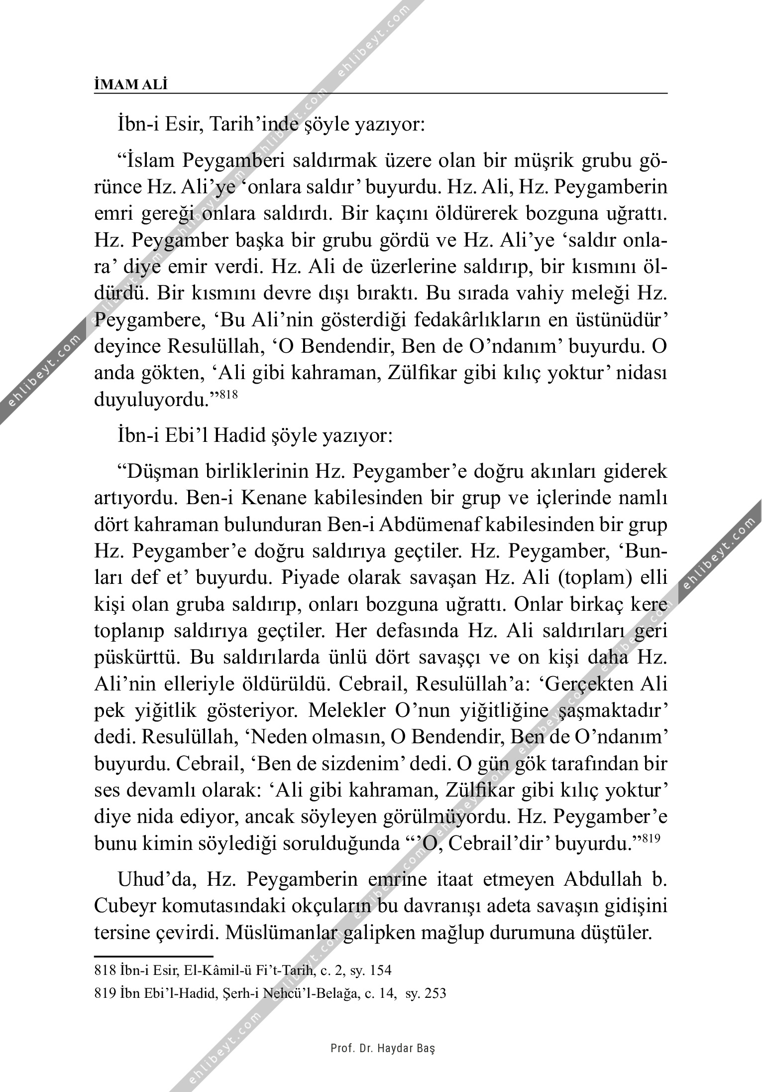 İbn-i Esir, Tarih'inde şöyle yazıyor: "İslam Peygamberi saldırmak üzere olan bir müşrik grubu görünce Hz. Ali'ye `onlara saldır' buyurdu. Hz. Ali, Hz. Peygamberin emri gereği onlara saldırdı. Bir kaçını öldürerek bozguna uğrattı. Hz. Peygamber başka bir grubu gördü ve Hz. Ali'ye `saldır onlara' diye emir verdi. Hz. Ali de üzerlerine saldırıp, bir kısmını öldürdü. Bir kısmını devre dışı bıraktı. Bu sırada vahiy meleği Hz. Peygambere, `Bu Ali'nin gösterdiği fedakârlıkların en üstünüdür' deyince Resulüllah, `O Bendendir, Ben de O'ndanım' buyurdu. O anda gökten, `Ali gibi kahraman, Zülfikar gibi kılıç yoktur' nidası duyuluyordu."818 İbn-i Ebi'l Hadid şöyle yazıyor: "Düşman birliklerinin Hz. Peygamber'e doğru akınları giderek artıyordu. Ben-i Kenane kabilesinden bir grup ve içlerinde namlı dört kahraman bulunduran Ben-i Abdümenaf kabilesinden bir grup Hz. Peygamber'e doğru saldırıya geçtiler. Hz. Peygamber, `Bunları def et' buyurdu. Piyade olarak savaşan Hz. Ali (toplam) elli kişi olan gruba saldırıp, onları bozguna uğrattı. Onlar […]