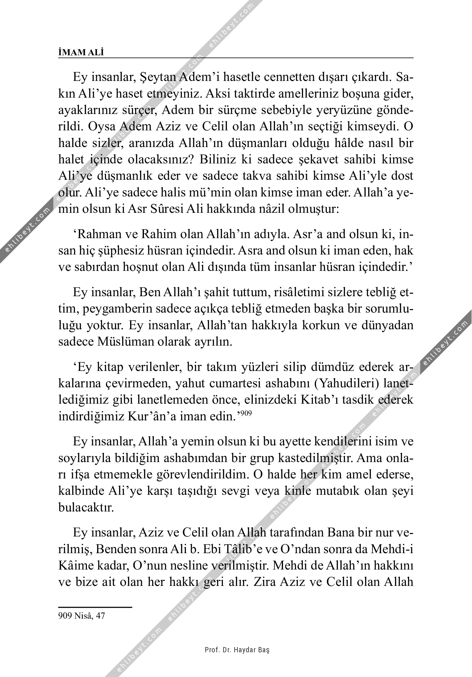 Ey insanlar, Şeytan Adem'i hasetle cennetten dışarı çıkardı. Sakın Ali'ye haset etmeyiniz. Aksi taktirde amelleriniz boşuna gider, ayaklarınız sürçer, Adem bir sürçme sebebiyle yeryüzüne gönderildi. Oysa Adem Aziz ve Celil olan Allah'ın seçtiği kimseydi. O halde sizler, aranızda Allah'ın düşmanları olduğu hâlde nasıl bir halet içinde olacaksınız? Biliniz ki sadece şekavet sahibi kimse Ali'ye düşmanlık eder ve sadece takva sahibi kimse Ali'yle dost olur. Ali'ye sadece halis mü'min olan kimse iman eder. Allah'a yemin olsun ki Asr Sûresi Ali hakkında nâzil olmuştur: `Rahman ve Rahim olan Allah'ın adıyla. Asr'a and olsun ki, insan hiç şüphesiz hüsran içindedir. Asra and olsun ki iman eden, hak ve sabırdan hoşnut olan Ali dışında tüm insanlar hüsran içindedir.' Ey insanlar, Ben Allah'ı şahit tuttum, risâletimi sizlere tebliğ ettim, peygamberin sadece açıkça tebliğ etmeden başka bir sorumluluğu yoktur. Ey insanlar, Allah'tan hakkıyla korkun ve dünyadan sadece Müslüman olarak ayrılın. […]