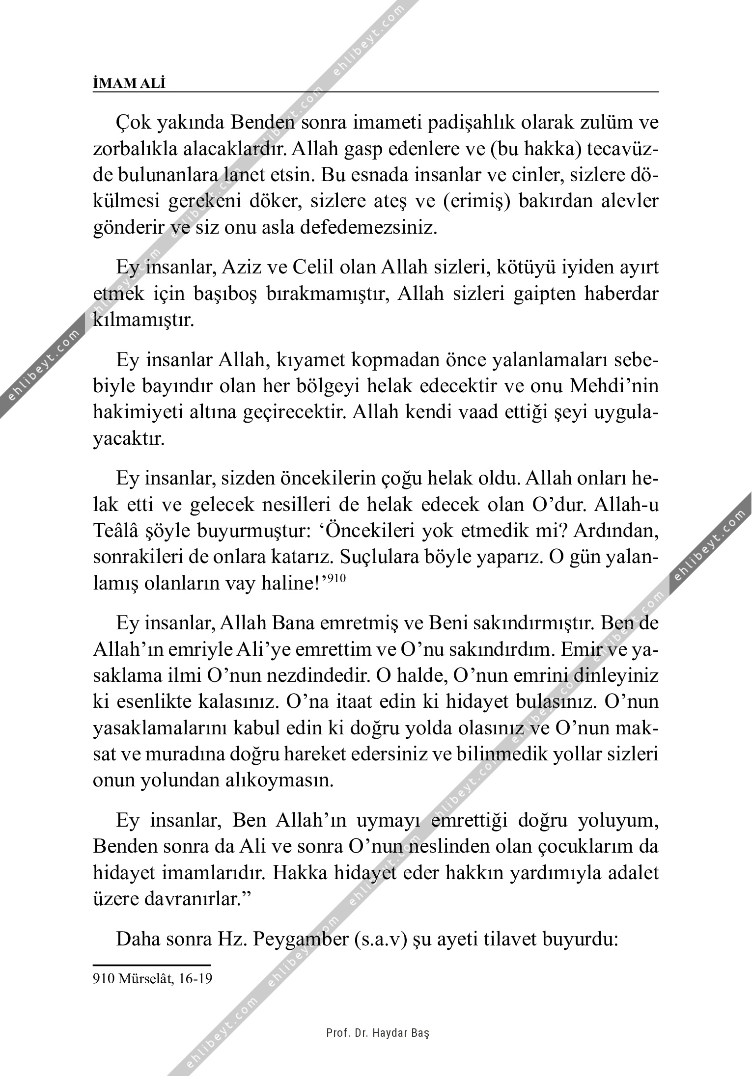 Çok yakında Benden sonra imameti padişahlık olarak zulüm ve zorbalıkla alacaklardır. Allah gasp edenlere ve (bu hakka) tecavüzde bulunanlara lanet etsin. Bu esnada insanlar ve cinler, sizlere dökülmesi gerekeni döker, sizlere ateş ve (erimiş) bakırdan alevler gönderir ve siz onu asla defedemezsiniz. Ey insanlar, Aziz ve Celil olan Allah sizleri, kötüyü iyiden ayırt etmek için başıboş bırakmamıştır, Allah sizleri gaipten haberdar kılmamıştır. Ey insanlar Allah, kıyamet kopmadan önce yalanlamaları sebebiyle bayındır olan her bölgeyi helak edecektir ve onu Mehdi'nin hakimiyeti altına geçirecektir. Allah kendi vaad ettiği şeyi uygulayacaktır. Ey insanlar, sizden öncekilerin çoğu helak oldu. Allah onları helak etti ve gelecek nesilleri de helak edecek olan O'dur. Allah-u Teâlâ şöyle buyurmuştur: `Öncekileri yok etmedik mi? Ardından, sonrakileri de onlara katarız. Suçlulara böyle yaparız. O gün yalanlamış olanların vay haline!'910 Ey insanlar, Allah Bana emretmiş ve Beni sakındırmıştır. Ben de Allah'ın emriyle Ali'ye emrettim ve […]
