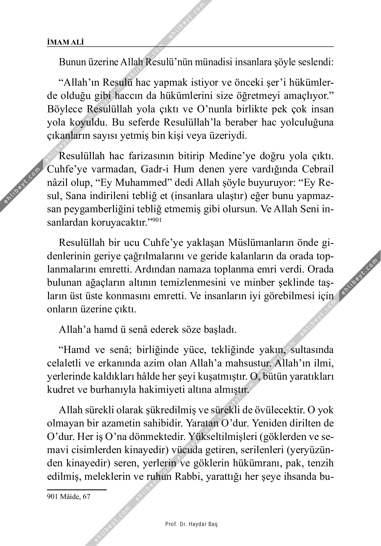 Bunun üzerine Allah Resulü'nün münadisi insanlara şöyle seslendi: "Allah'ın Resulü hac yapmak istiyor ve önceki şer'i hükümlerde olduğu gibi haccın da hükümlerini size öğretmeyi amaçlıyor." Böylece Resulüllah yola çıktı ve O'nunla birlikte pek çok insan yola koyuldu. Bu seferde Resulüllah'la beraber hac yolculuğuna çıkanların sayısı yetmiş bin kişi veya üzeriydi. Resulüllah hac farizasının bitirip Medine'ye doğru yola çıktı. Cuhfe'ye varmadan, Gadr-i Hum denen yere vardığında Cebrail nâzil olup, "Ey Muhammed" dedi Allah şöyle buyuruyor: "Ey Resul, Sana indirileni tebliğ et (insanlara ulaştır) eğer bunu yapmazsan peygamberliğini tebliğ etmemiş gibi olursun. Ve Allah Seni insanlardan koruyacaktır."901 Resulüllah bir ucu Cuhfe'ye yaklaşan Müslümanların önde gidenlerinin geriye çağrılmalarını ve geride kalanların da orada toplanmalarını emretti. Ardından namaza toplanma emri verdi. Orada bulunan ağaçların altının temizlenmesini ve minber şeklinde taşların üst üste konmasını emretti. Ve insanların iyi görebilmesi için onların üzerine çıktı. Allah'a hamd ü senâ ederek […]