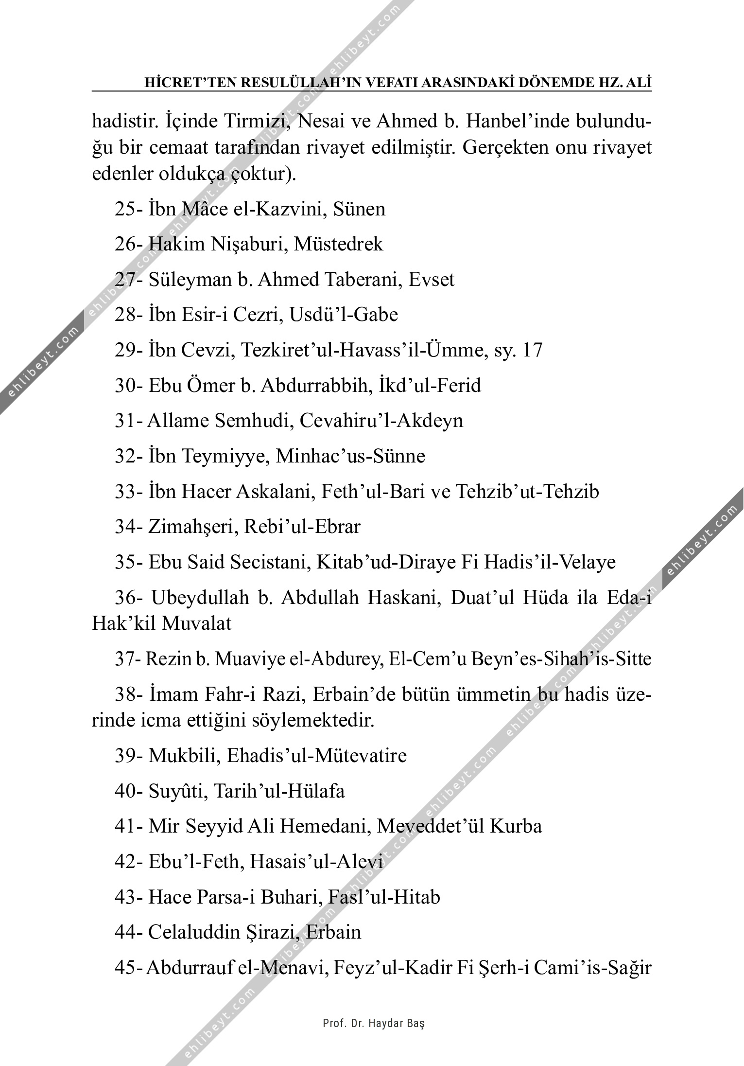 hadistir. İçinde Tirmizi, Nesai ve Ahmed b. Hanbel'inde bulunduğu bir cemaat tarafından rivayet edilmiştir. Gerçekten onu rivayet edenler oldukça çoktur). 25- İbn Mâce el-Kazvini, Sünen 26- Hakim Nişaburi, Müstedrek 27- Süleyman b. Ahmed Taberani, Evset 28- İbn Esir-i Cezri, Usdü'l-Gabe 29- İbn Cevzi, Tezkiret'ul-Havass'il-Ümme, sy. 17 30- Ebu Ömer b. Abdurrabbih, İkd'ul-Ferid 31- Allame Semhudi, Cevahiru'l-Akdeyn 32- İbn Teymiyye, Minhac'us-Sünne 33- İbn Hacer Askalani, Feth'ul-Bari ve Tehzib'ut-Tehzib 34- Zimahşeri, Rebi'ul-Ebrar 35- Ebu Said Secistani, Kitab'ud-Diraye Fi Hadis'il-Velaye 36- Ubeydullah b. Abdullah Haskani, Duat'ul Hüda ila Eda-i Hak'kil Muvalat 37- Rezin b. Muaviye el-Abdurey, El-Cem'u Beyn'es-Sihah'is-Sitte 38- İmam Fahr-i Razi, Erbain'de bütün ümmetin bu hadis üzerinde icma ettiğini söylemektedir. 39- Mukbili, Ehadis'ul-Mütevatire 40- Suyûti, Tarih'ul-Hülafa 41- Mir Seyyid Ali Hemedani, Meveddet'ül Kurba 42- Ebu'l-Feth, Hasais'ul-Alevi 43- Hace Parsa-i Buhari, Fasl'ul-Hitab 44- Celaluddin Şirazi, Erbain 45- Abdurrauf el-Menavi, Feyz'ul-Kadir Fi Şerh-i Cami'is-Sağir